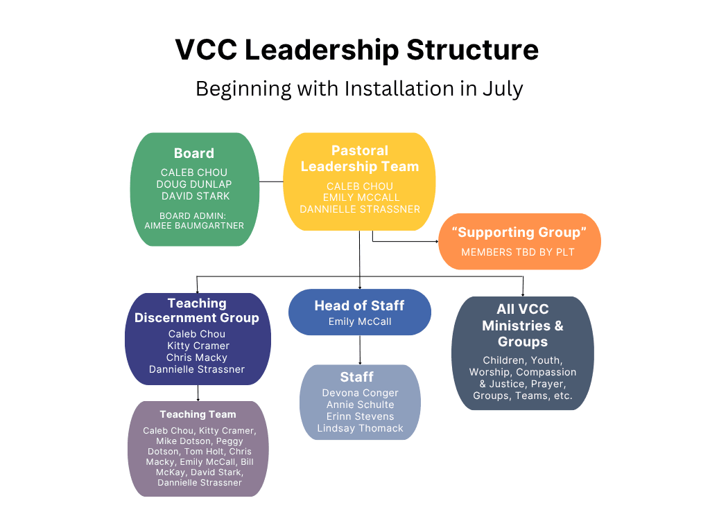 VCC's Leadership Structure, beginning July 19Note: The “Supporting Group” will commit to spiritual support, counsel, and intercession together for the Pastoral Leadership Team. It will not have decision-making responsibility.